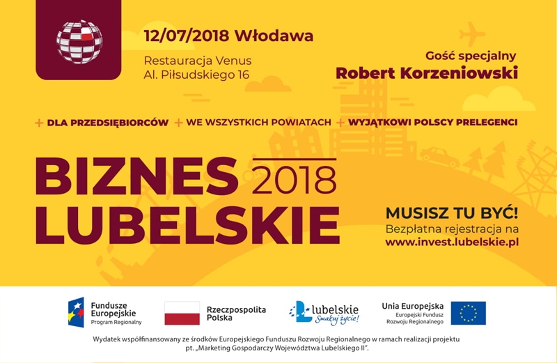 Prowadzisz firmę w powiecie włodawskim? Przyjdź na spotkanie z cyklu „Biznes Lubelskie”, które odbędzie się we Włodawie 12 lipca 2018 r. o godz. 13.30 w Restauracji Venus przy al. J. Piłsudskiego 16. Gościem specjalnym spotkania będzie czterokrotny mistrz olimpijski Robert Korzeniowski.