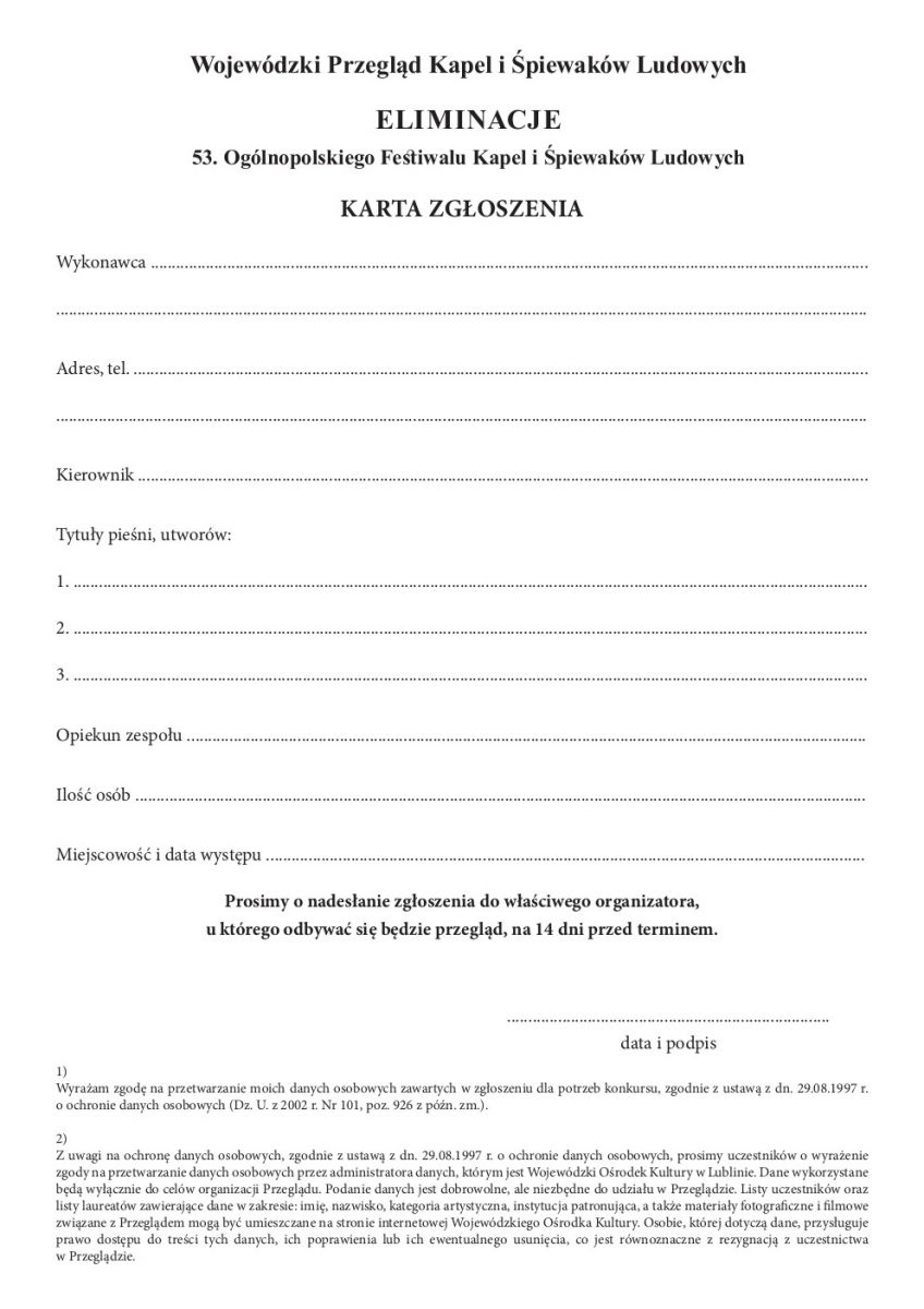 Kapele ludowe, zespoły śpiewacze i soliści z terenu powiatu włodawskiego odbędą eliminajce we Włodawskim Domu Kultury, 13 kwietnia 2019 r. od godz. 10.00. Kartę zgłoszenia należy przesłać do WDK na 14 dni przed ustalonym terminem.
