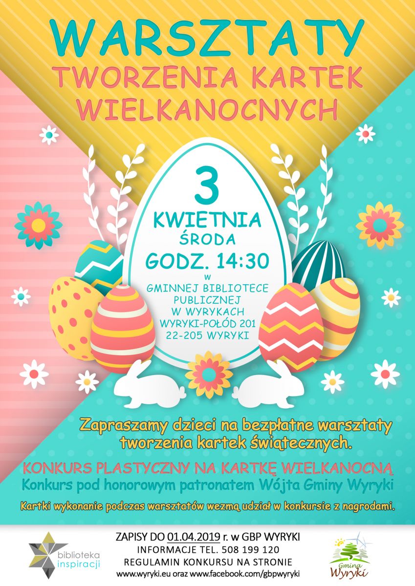 Zapraszamy dzieci do udziału w bezpłatnych warsztatach tworzenia kartek wielkanocnych, które odbędą się 3 kwietnia 2019 r. o godz. 14:30 w Gminnej Bibliotece Publicznej w Wyrykach. Kartki wykonanie podczas warsztatów wezmą udział w konkursie z nagrodami ufundowanymi przez Wójta Gminy Wyryki, który sprawuje patronat honorowy nad konkursem.