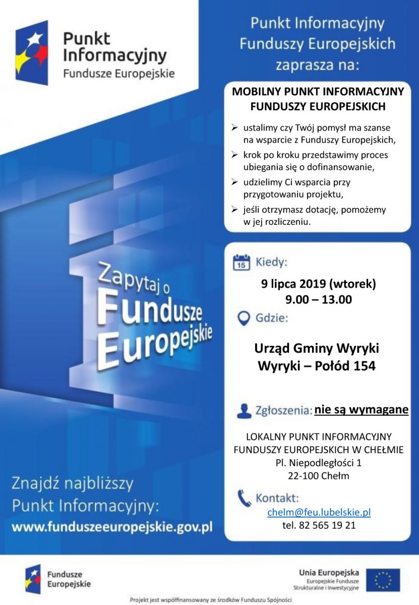 - 9 lipca 2019 r. (w godz. 9.00-13.00) eksperci Punktów Informacyjnych Funduszy Europejskich będą do dyspozycji mieszkańców gminy Wyryki (Urząd Gminy Wyryki, Wyryki-Połód 154).