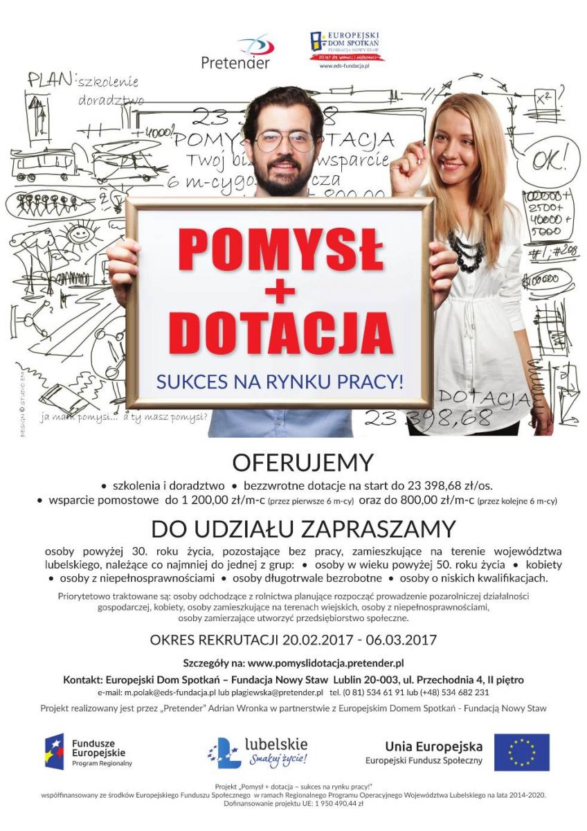 Od 1 marca 2017 roku rusza rekrutacja do projektu „Pomysł + dotacja – sukces na rynku pracy!”. Projekt przeznaczony jest dla osób bezrobotnych powyżej 30 roku życia zamieszkujących obszar województwa lubelskiego i pragnących założyć działalność gospodarczą.