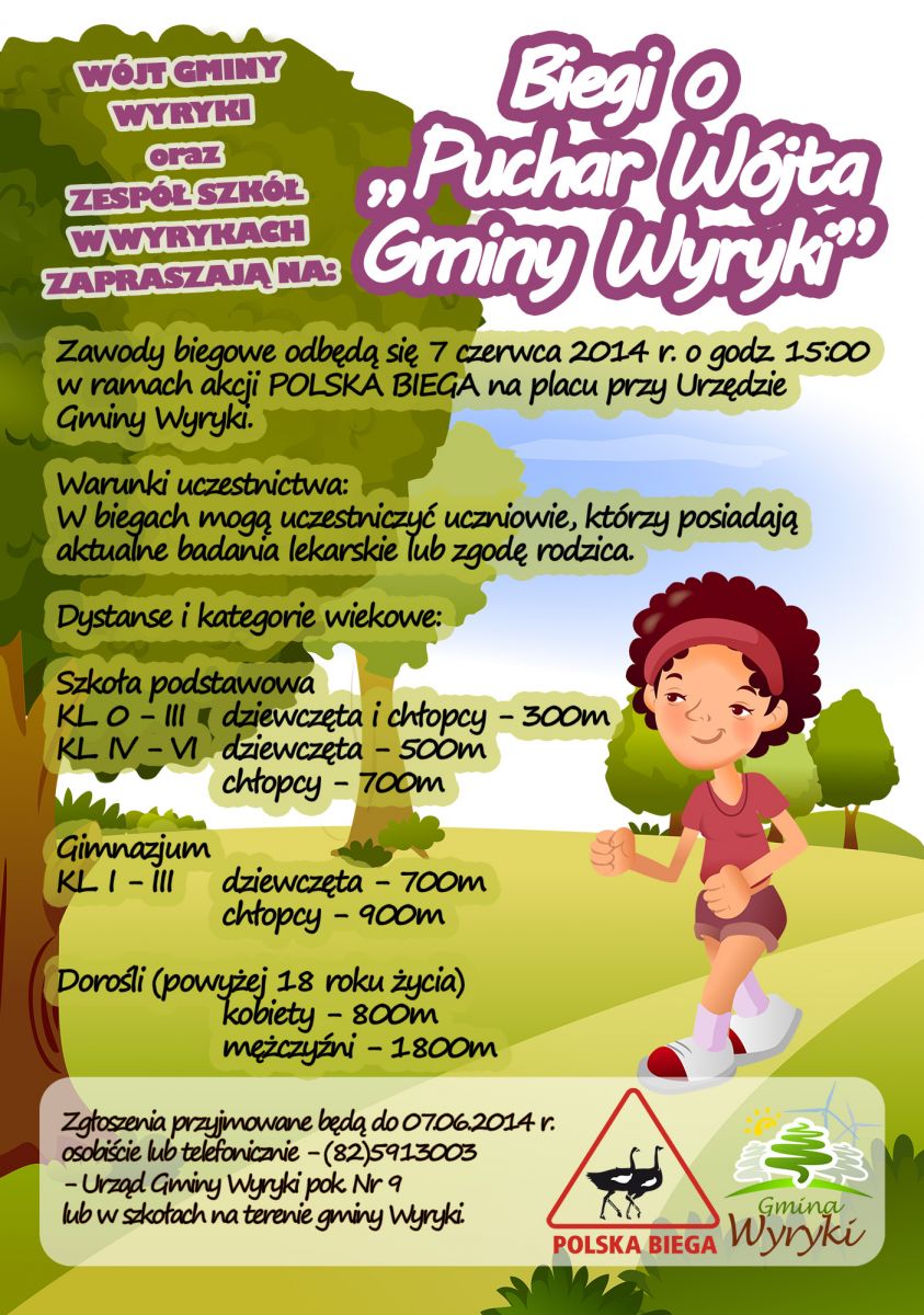 Wójt Gminy Wyryki oraz Zespół Szkół w Wyrykach zapraszają na biegi o "Puchar Wójta Gminy Wyryki" w ramach akcji POLSKA BIEGA, które odbędą się 7 czerwca 2014 r. na placu przy Urzędzie Gminy Wyryki.